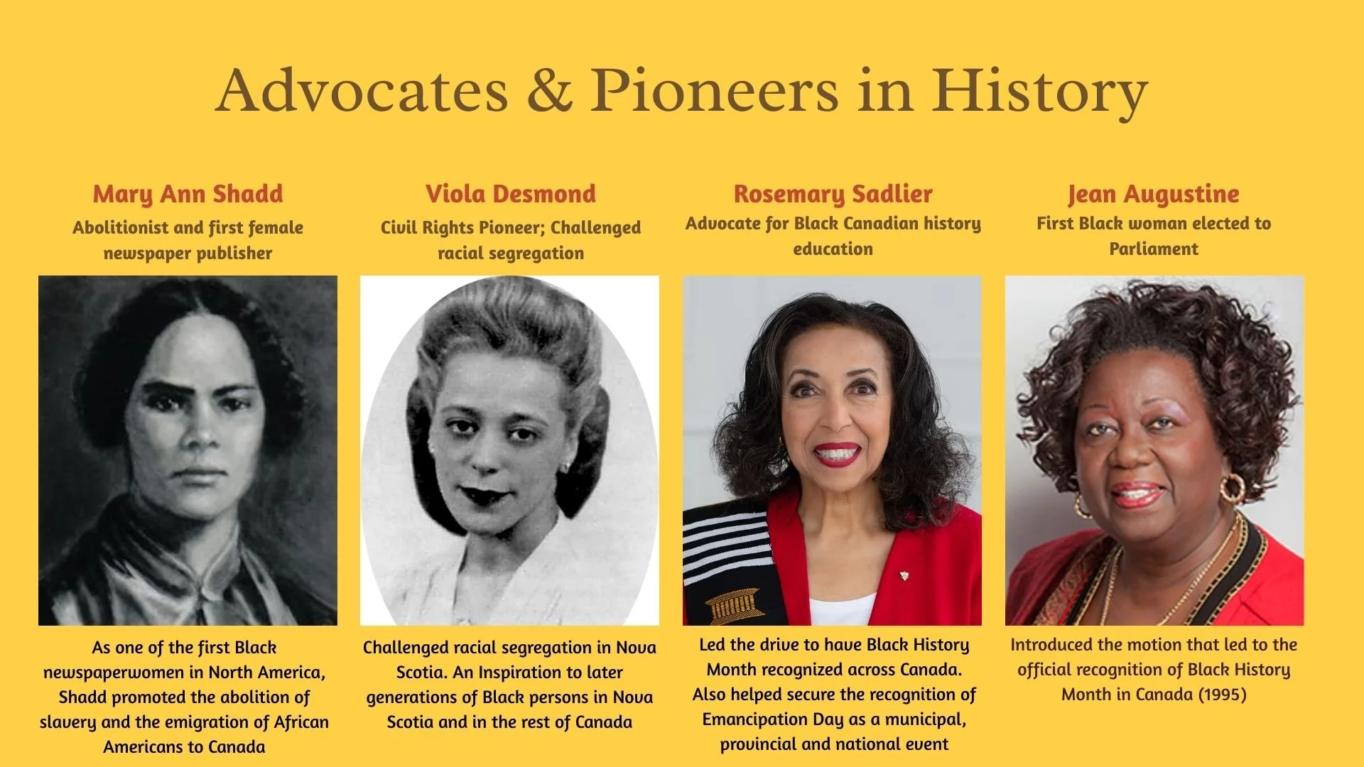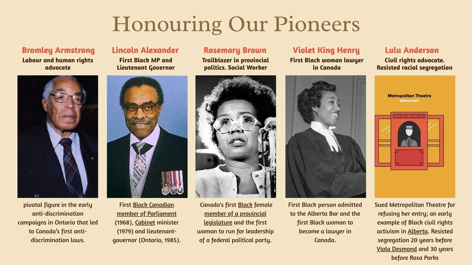 Honouring Black brilliance also requires acknowledging those who challenged injustice and expanded rights long before equity was widely named as a public value. Figures such as Viola Desmond, Mary Ann Shadd, Bromley Armstrong, Lincoln Alexander, and Rosemary Brown confronted segregation, labour exclusion, and political marginalization, often at great personal cost. Their advocacy laid the groundwork for many of the legal protections and public conversations that exist today.